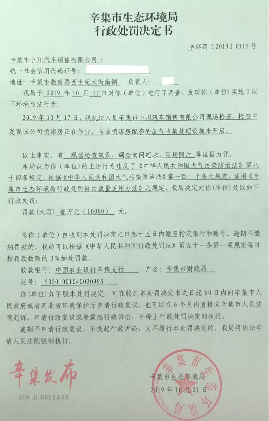 10月17日,市生態(tài)環(huán)境局執(zhí)法人員現(xiàn)場檢查時(shí)發(fā)現(xiàn),辛集市卜川汽車銷售有限公司噴漆房正在作業(yè),但與該噴漆房配套的廢氣收集處理設(shè)施未開啟。